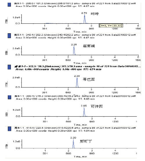 圖1 從上至下分別為:重慶雞公褒醬樣品中嗎啡、罌粟堿、蒂巴因、可待因、那可丁的LC-MS-MS-MRM色譜圖: