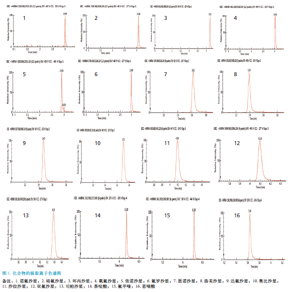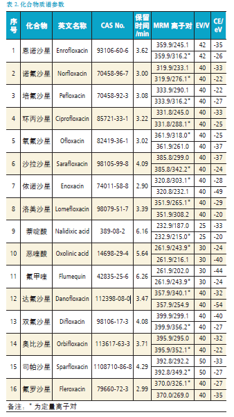 以下參數以PerkinElmerQSight 200 系列為例,喹諾酮類化合物質譜參數見表2。