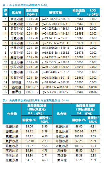 其余喹諾酮目標化合物的標準曲線在0.01-50 ng/mL,依次為0.01,0.02,0.05,0.1,0.2,0.5,1.0,2.0,5.0,10.0,20.0,50.0 ng/mL。其中,諾氟沙星和環丙沙星為0.05-50 ng/mL,萘啶酸和氟甲喹為0.001-10 ng/mL。標準曲線范圍內具有良好的線性(R2> 0.994);采用魚肉基質作為加標樣品,平行6 個樣品測試方法的回收率和方法重現性,詳細結果請見表4。從表4 可以看到,在加標濃度為2 ng/mL 下,回收率為92.25-105.87 %,方法重現性為1.53-4.78%。最低定量限為0.0002-0.01μg/kg,完全符合殘留檢測要求。