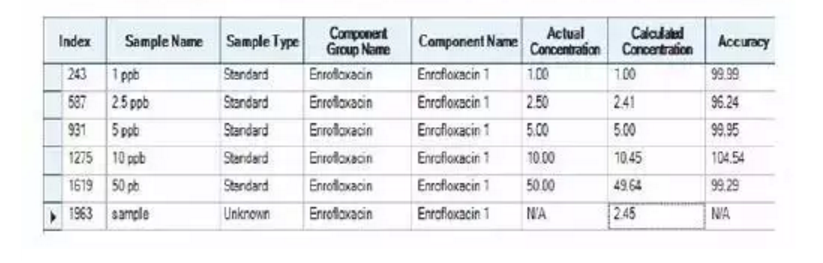 Table 1. 某超市雞肉中恩諾沙星的定量結(jié)果為2.45 ng/mL。