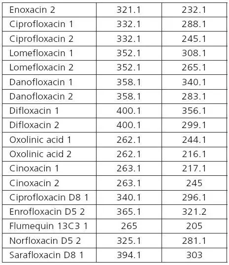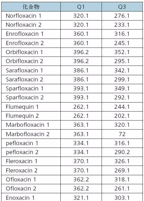 通常建立液質(zhì)聯(lián)用(LC-MS/MS)方法時需要使用標(biāo)準(zhǔn)品進(jìn)行MRM質(zhì)譜方法優(yōu)化,包括母離子、子離子以及相應(yīng)的電壓參數(shù),費(fèi)錢、費(fèi)時、費(fèi)力。本方法針對GB/T 20751-2006中喹諾酮類藥物及其內(nèi)標(biāo),建立了MRM離子對信息、質(zhì)譜參數(shù)、液相條件,省去了優(yōu)化步驟,可直接用于水產(chǎn)品中喹諾酮類藥物的測定。