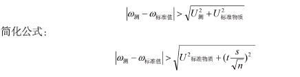 如果實驗室對標準物質的測量值超出了標準物質特性量值的不確定度范圍,是不能直接得出測量結果存在偏差的結論的,原因是標準物質的不確定度U標準物質僅包括了與標準物質定值、均勻性、穩定性有關的不確定度,沒有涉及用戶在實驗室里對標準物質進行測量有關的隨機不確定度U測。因此,應采取以下通用公式判斷標準物質測量值與標準值之間存在顯著偏差: