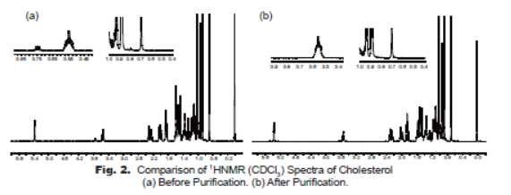 The product has been characterized by 1HNMR and HPLC. The 1HNMR spectrum (Fig. 2) is characteristic to the standard 1HNMR spectrum. As shown in the 1HNMR spectra, the impurities at 3.75 ppm, 0.75-0.9 ppm, 0.5-0.7 ppm before purification (Fig. 2-a) are almost completely removed through the two-step chemical purification process (Fig. 2-b).