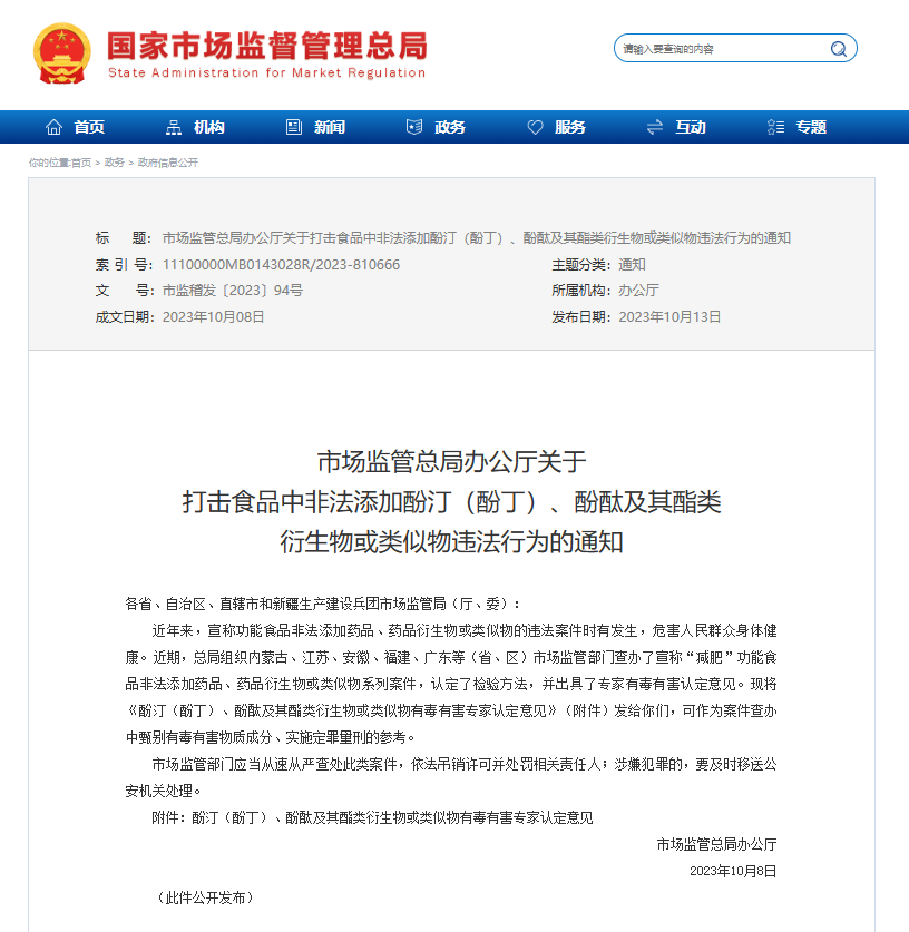 國家市場監督管理總局發布關于打擊食品中非法添加酚汀(酚丁)、酚酞及其脂類衍生物或類似物違法行為的通知,加強了對食品中非法添加的監管。